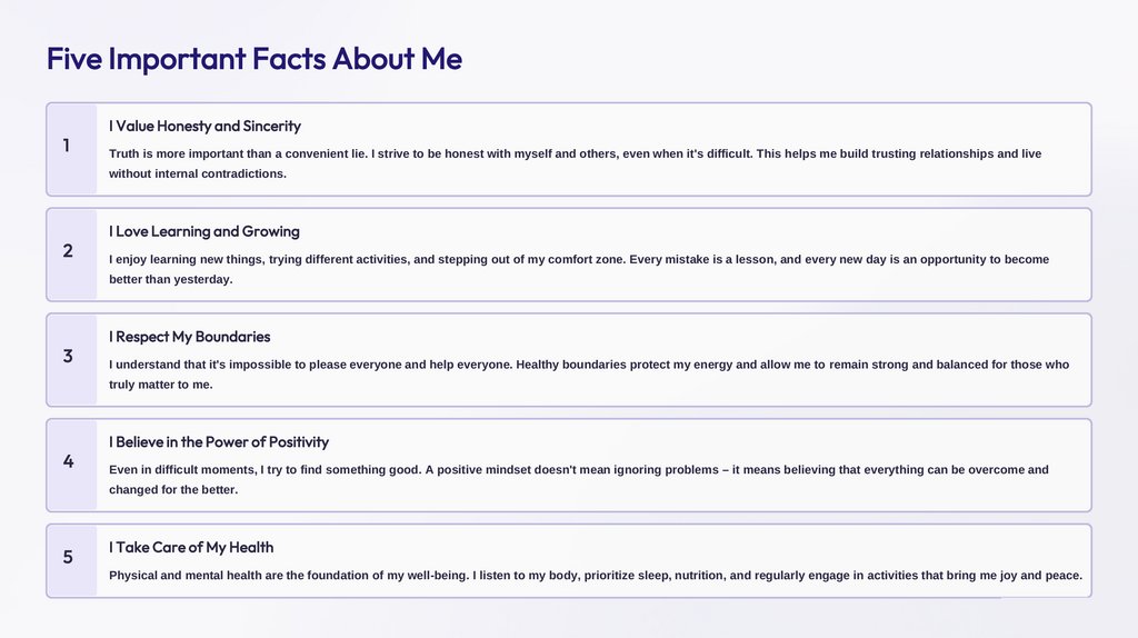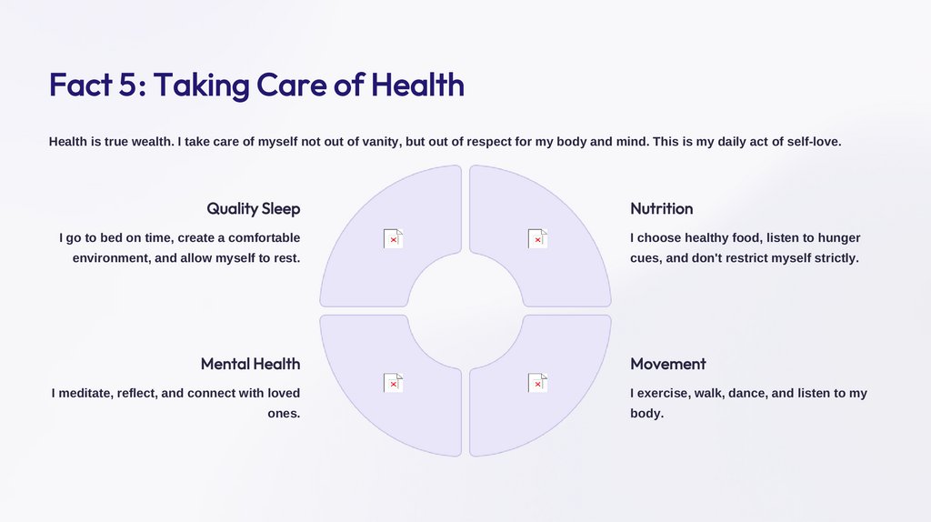 Fact 5: Taking Care of HealthHealth is true wealth. I take care of myself not out of vanity, but out of respect for my body and mind. This is my daily act of self-love.