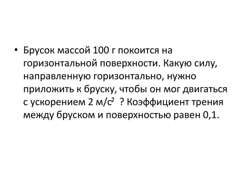 • Брусок массой 100 г покоится нагоризонтальной поверхности. Какую силу,