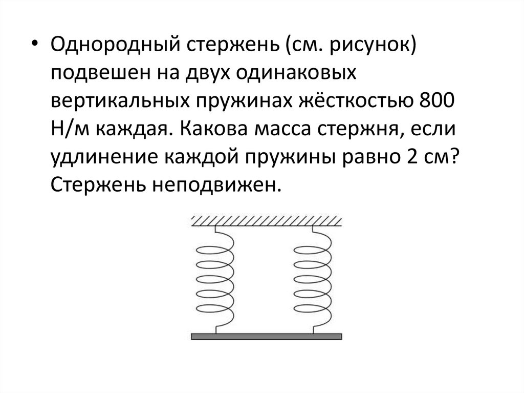 • Однородный стержень (см. рисунок)подвешен на двух одинаковых