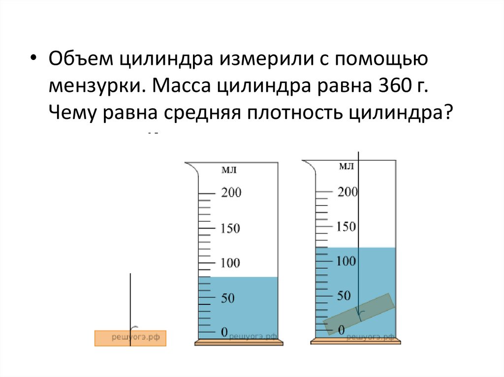 • Объем цилиндра измерили с помощьюмензурки. Масса цилиндра равна 360 г.