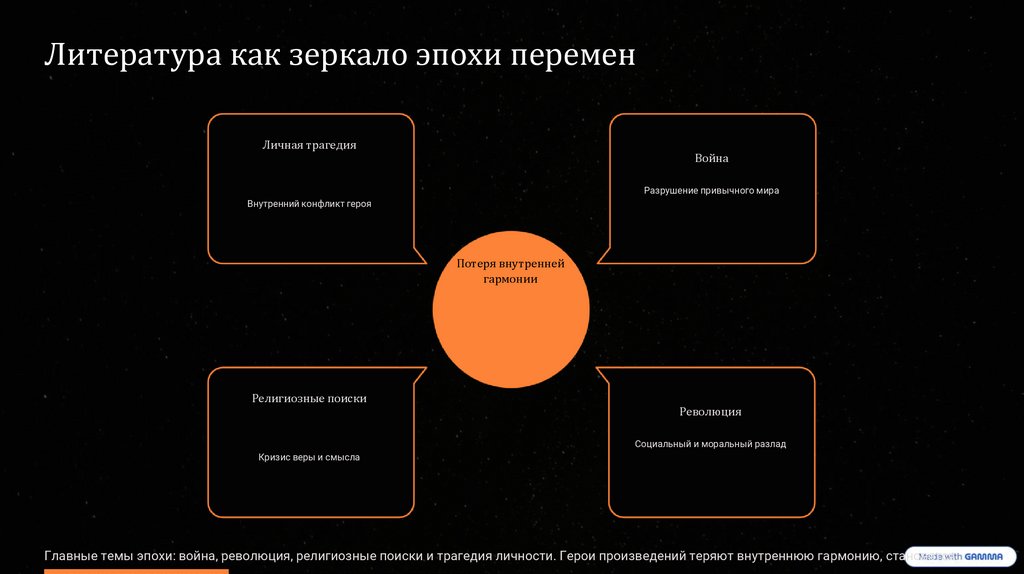 Главные темы эпохи: война, революция, религиозные поиски и трагедия личности. Герои произведений теряют внутреннюю гармонию, становятся
