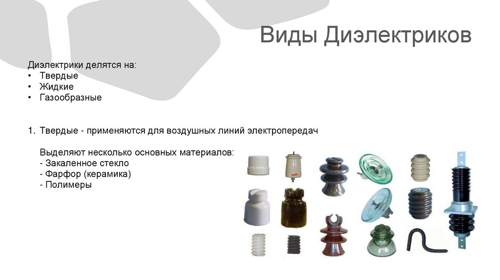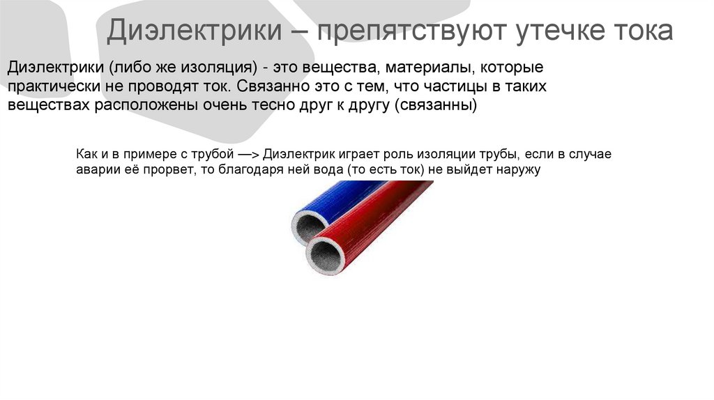 Диэлектрики – препятствуют утечке токаДиэлектрики (либо же изоляция) - это вещества, материалы, которые