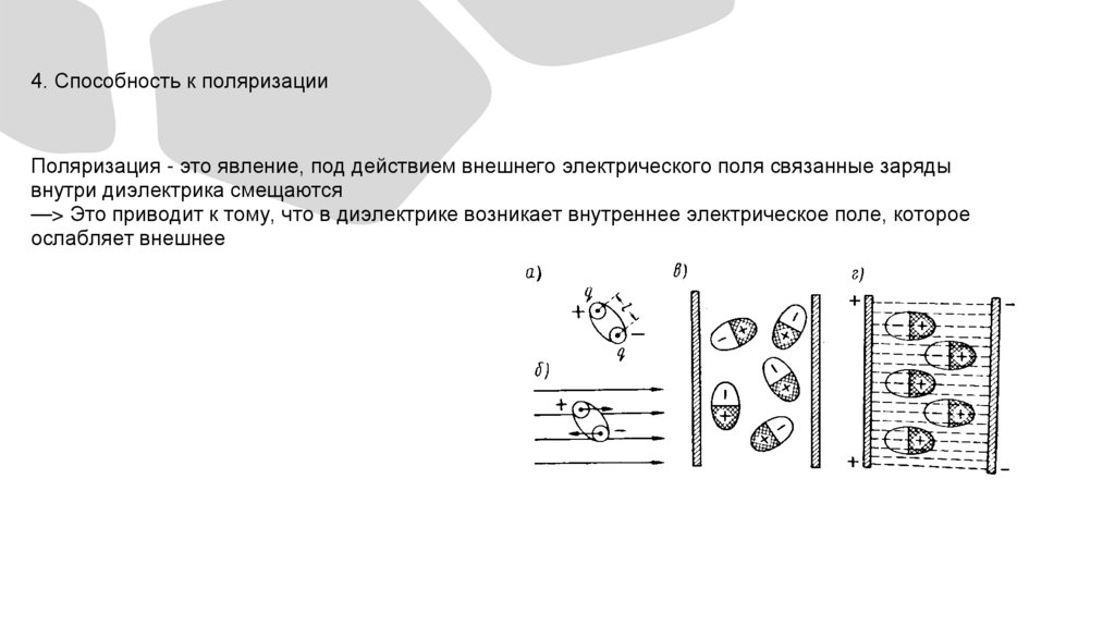 4. Способность к поляризацииПоляризация - это явление, под действием внешнего электрического поля связанные заряды