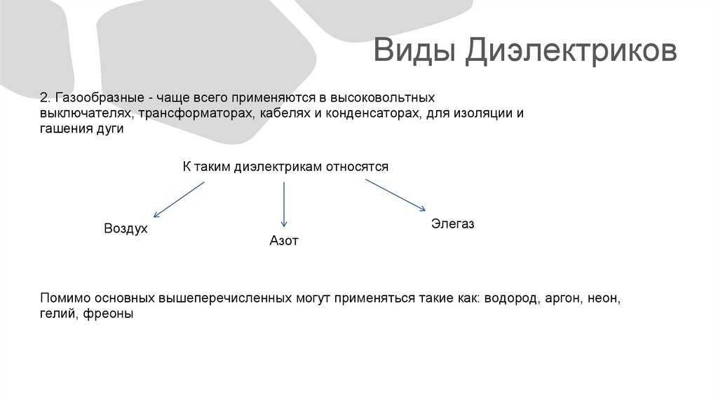 Виды Диэлектриков2. Газообразные - чаще всего применяются в высоковольтных