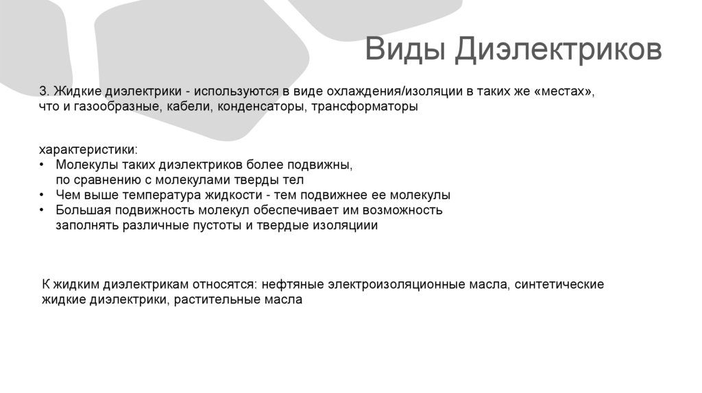 Виды Диэлектриков3. Жидкие диэлектрики - используются в виде охлаждения/изоляции в таких же «местах»,