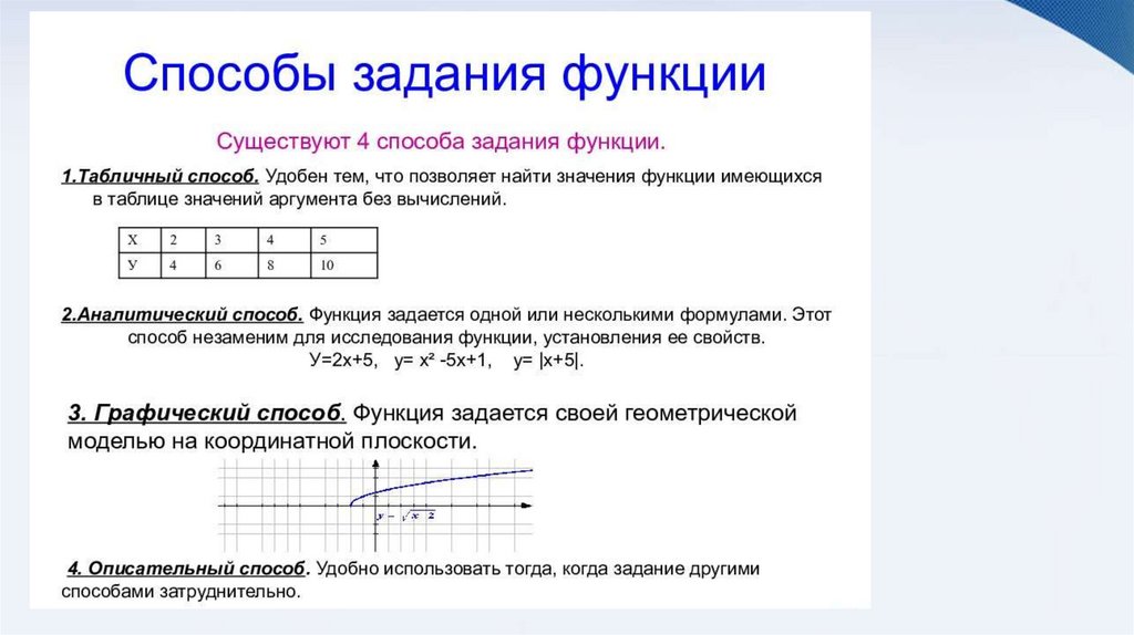 1. Функция, способы задания функции. Взаимно обратные функции. График функции. Область определения и множество значений функции.