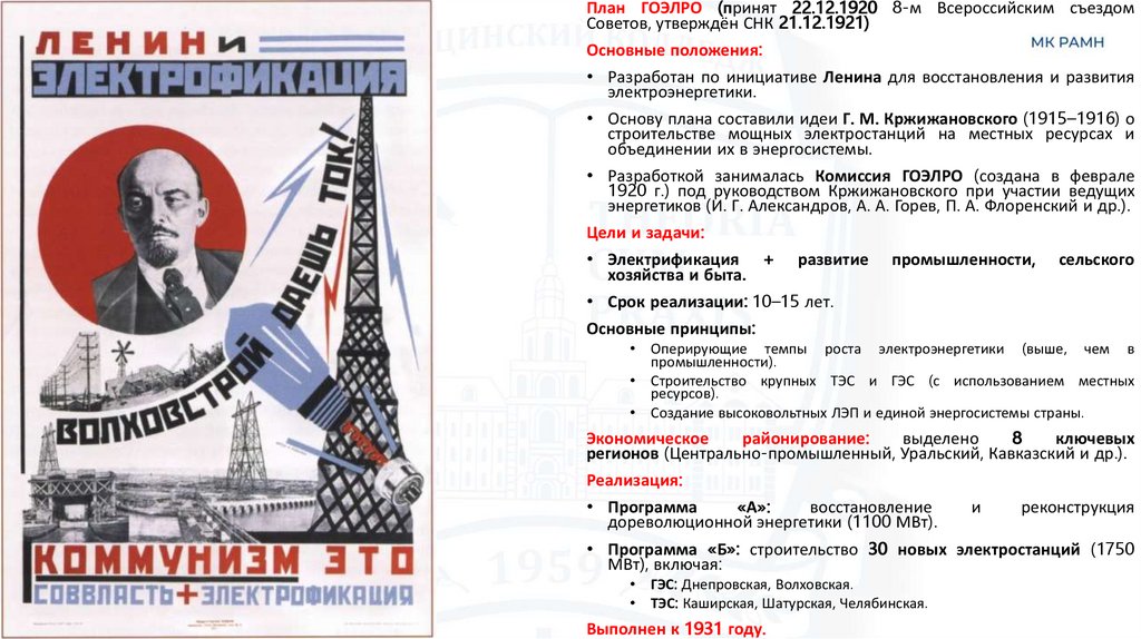 План ГОЭЛРО (принят 22.12.1920 8-м Всероссийским съездомСоветов, утверждён СНК 21.12.1921)