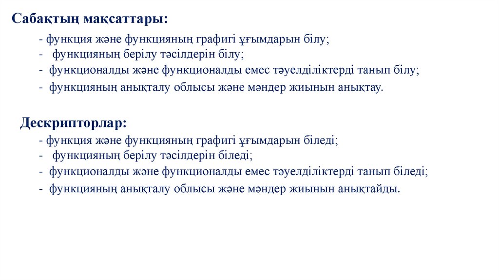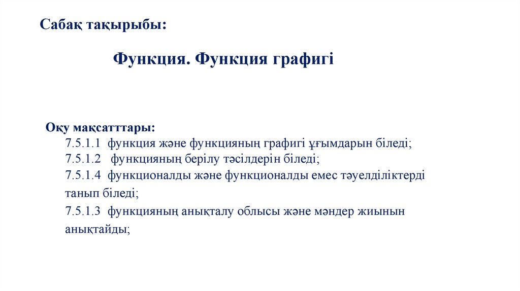 Сабақтың мақсаттары:- функция және функцияның графигі ұғымдарын білу;