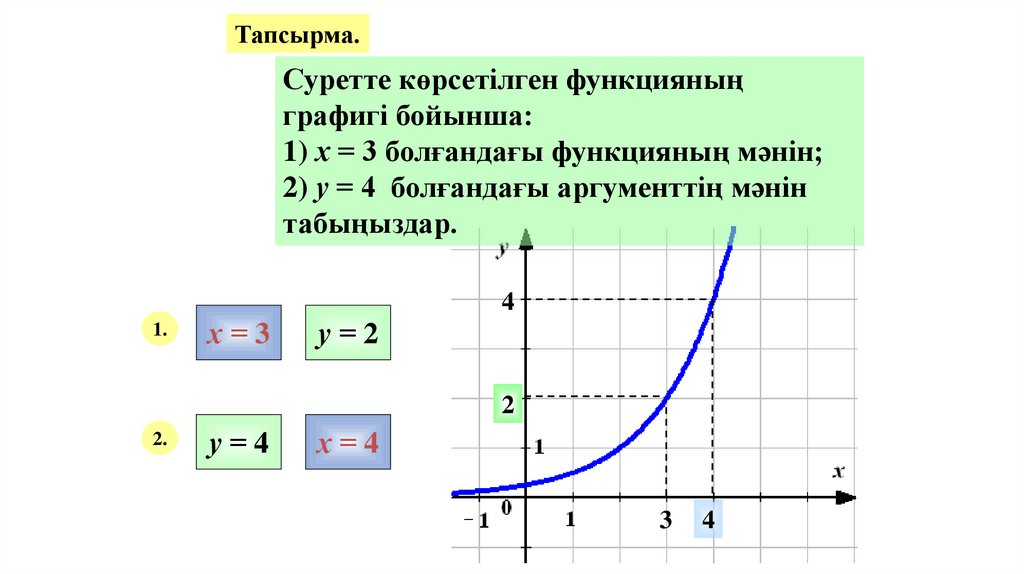Аргументтің қандай мәнінде функцияның мәні 5; 10; 100? Тең болады? Функцияның анықталу облысын