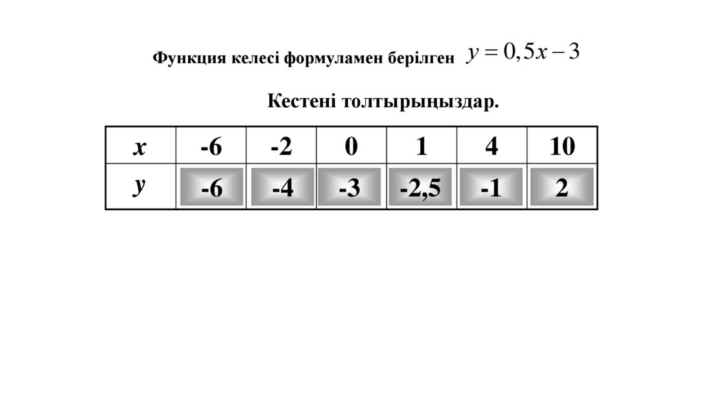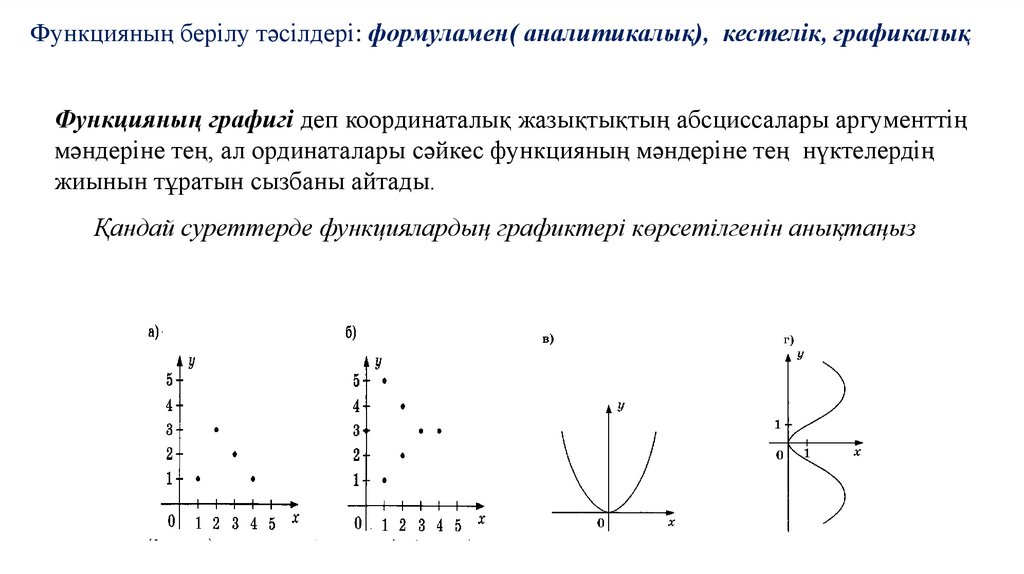 Функцияның берілу тәсілдері: формуламен( аналитикалық), кестелік, графикалықФункцияның графигі деп координаталық жазықтықтың абсциссалары аргументтің