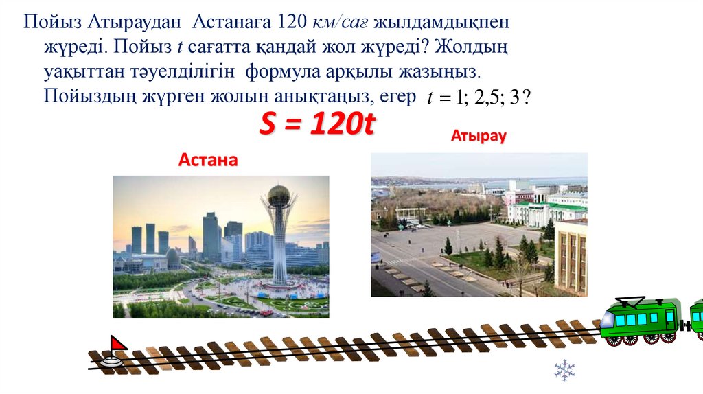 Пойыз Атыраудан Астанаға 120 км/сағ жылдамдықпенжүреді. Пойыз t сағатта қандай жол жүреді? Жолдың