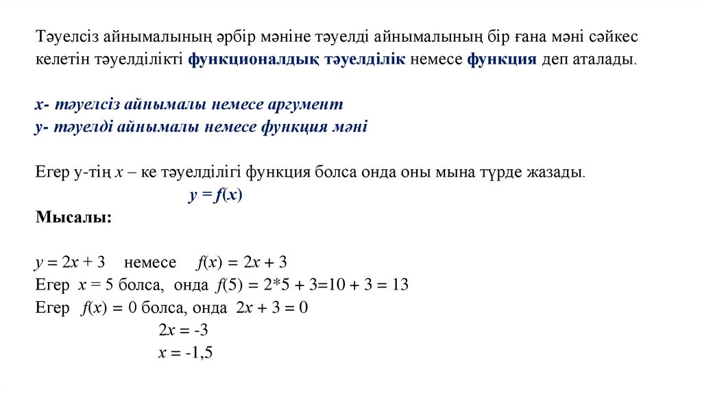 Егер х = 5 болса, онда f(5) = 2*5 + 3=10 + 3 = 13