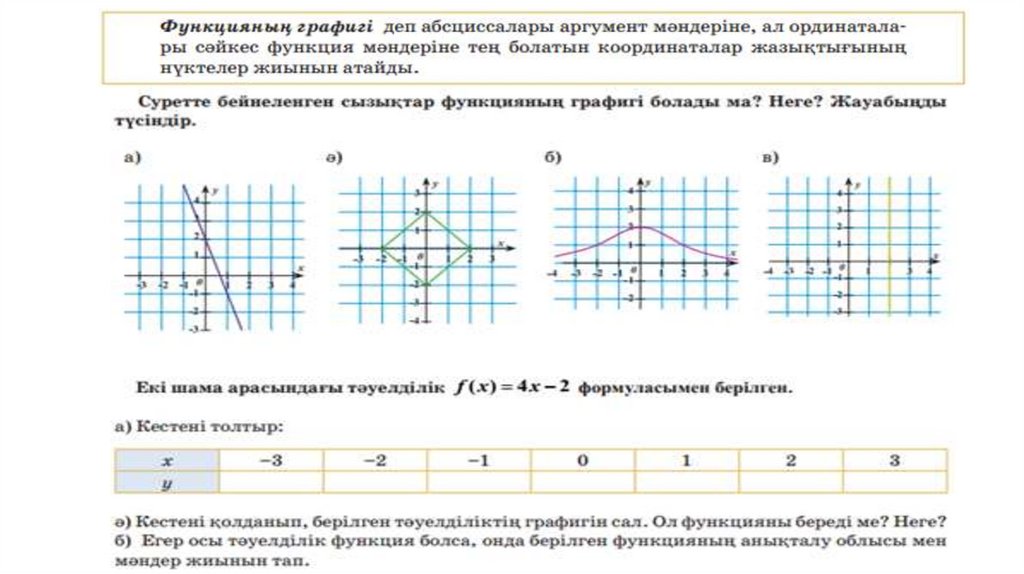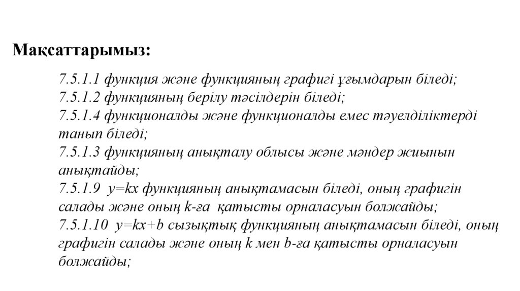 Мақсаттарымыз:7.5.1.1 функция және функцияның графигі ұғымдарын біледі;