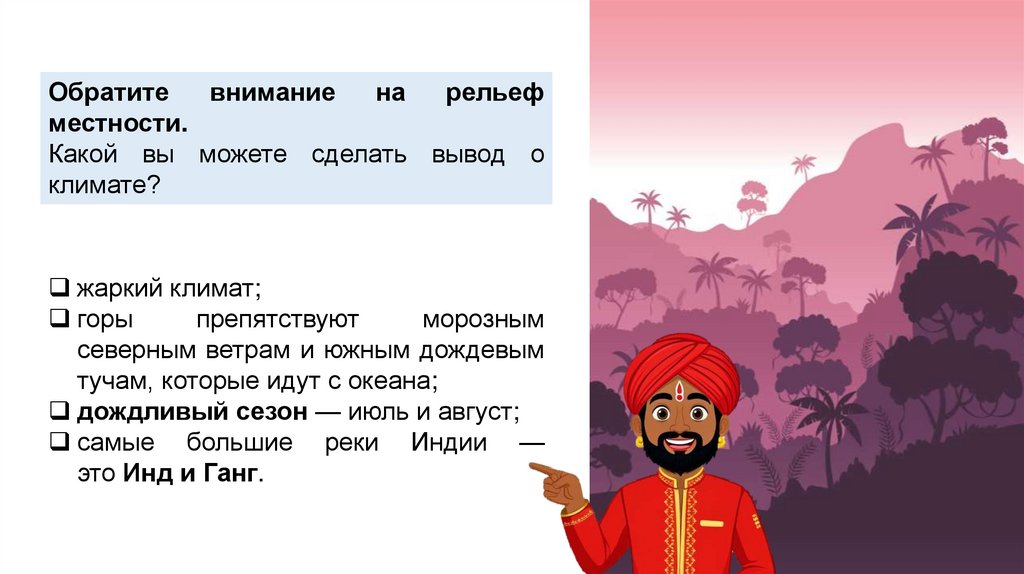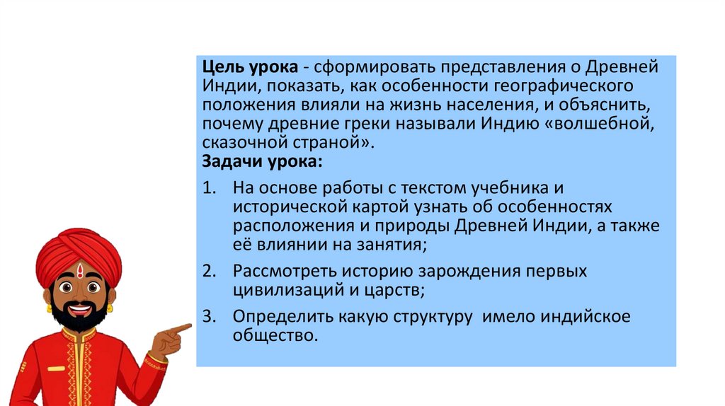 Цель урока - сформировать представления о ДревнейИндии, показать, как особенности географического