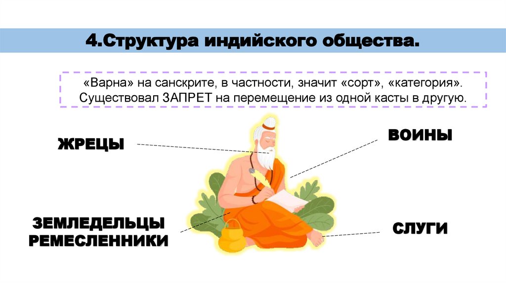 4.Структура индийского общества.«Варна» на санскрите, в частности, значит «сорт», «категория».