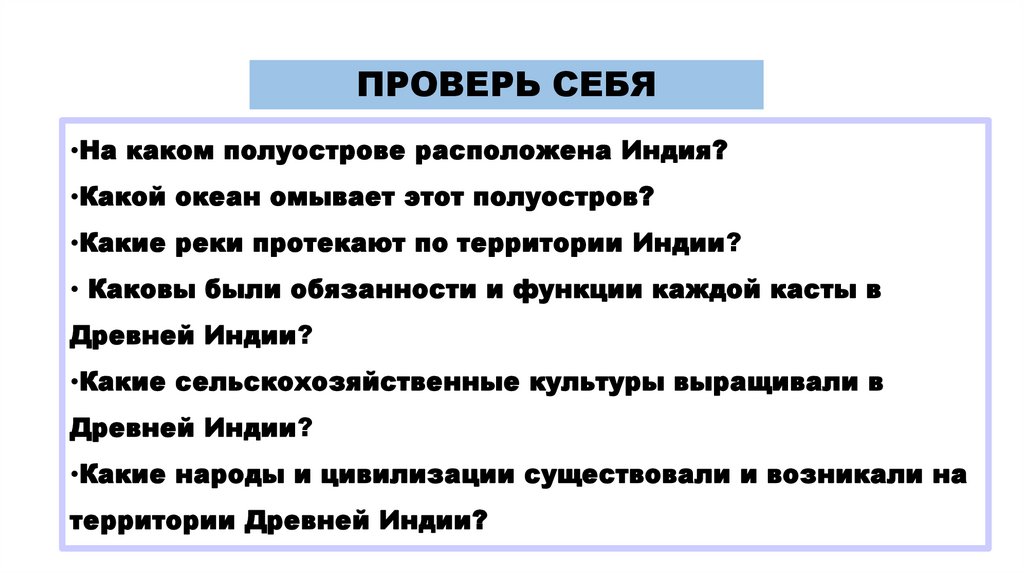 ПРОВЕРЬ СЕБЯ•На каком полуострове расположена Индия?