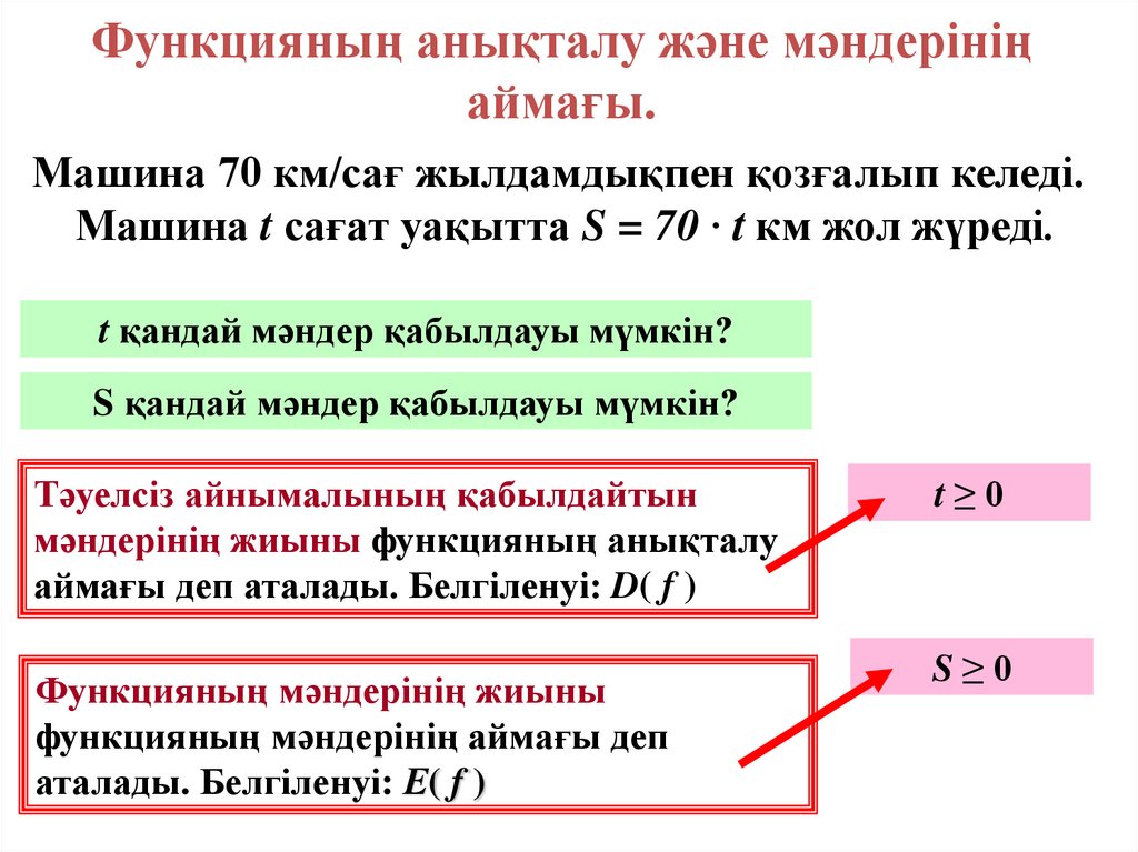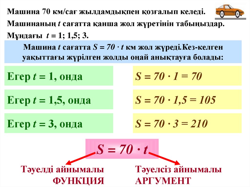 Машина t сағатта S = 70 · t км жол жүреді.Кез-келген