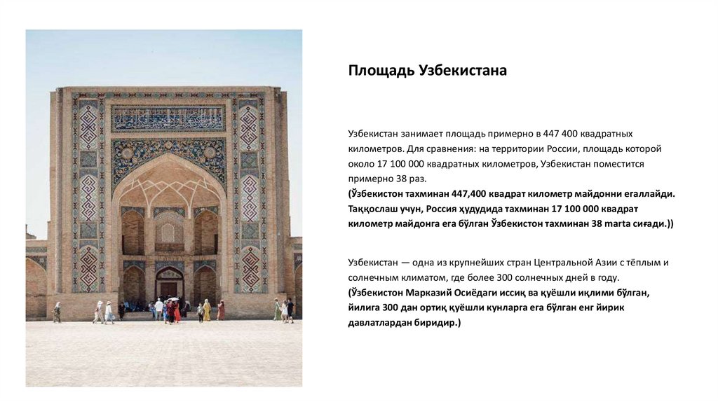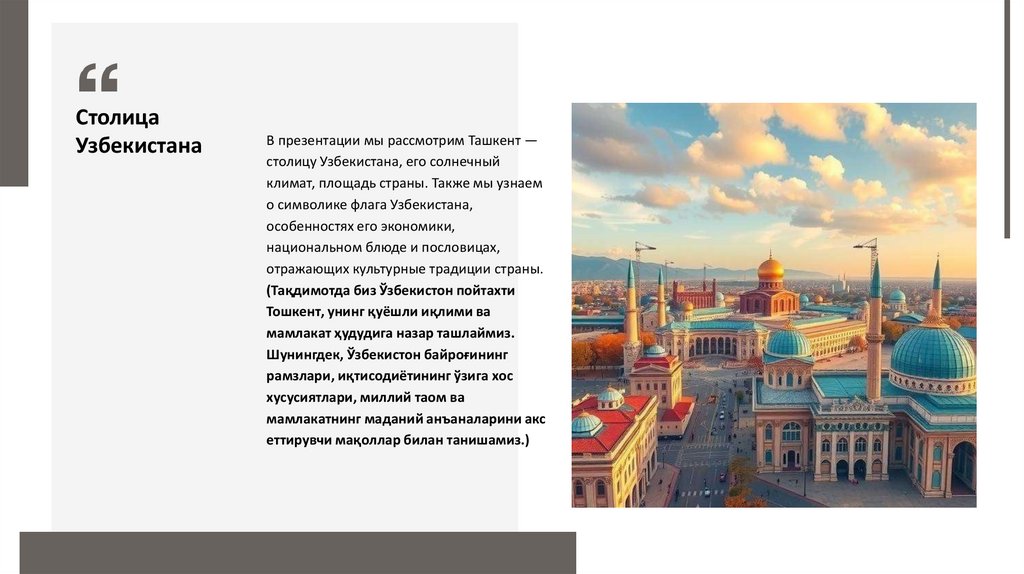 Рассказ об Узбекистане 1. Столица_ • Русский_ Столица Узбекистана – Ташкент, крупнейший город Центральной Азии. • Узбекский_ O‘zbekistonning poyta