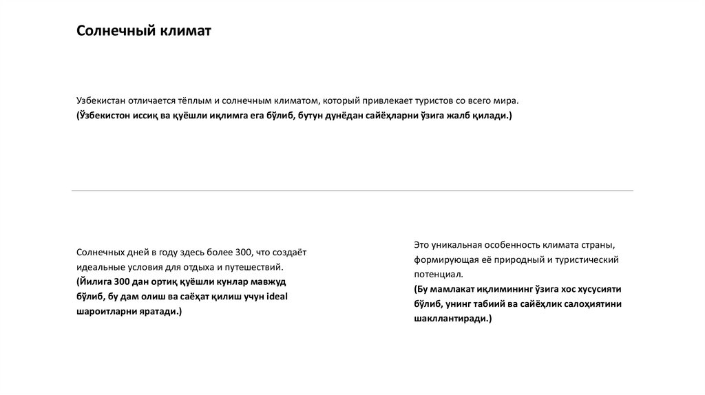 (Ўзбекистон иссиқ ва қуёшли иқлимга ега бўлиб, бутун дунёдан сайёҳларни ўзига жалб қилади.)