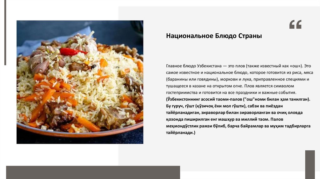 Национальное Блюдо СтраныГлавное блюдо Узбекистана — это плов (также известный как «ош»). Это
