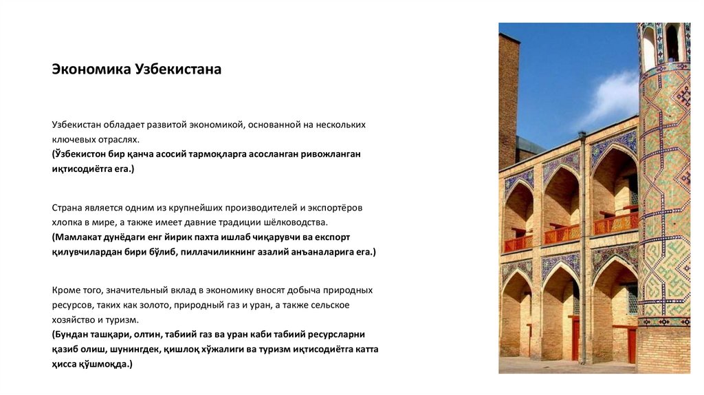 Экономика УзбекистанаУзбекистан обладает развитой экономикой, основанной на нескольких