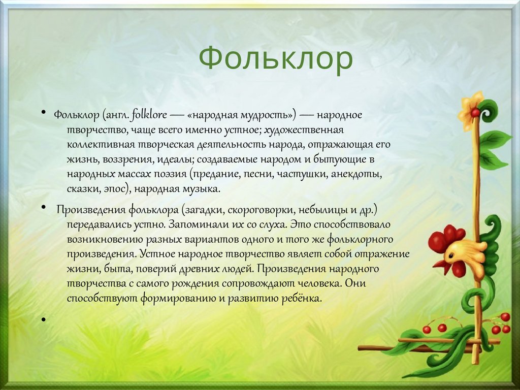 Фольклор• Фольклор (англ. folklore — «народная мудрость») — народное