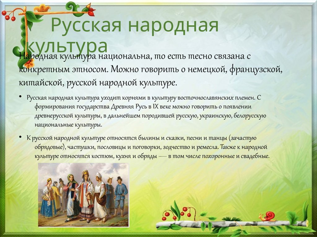 • Русская народная культура уходит корнями в культуру восточнославянских племен. С