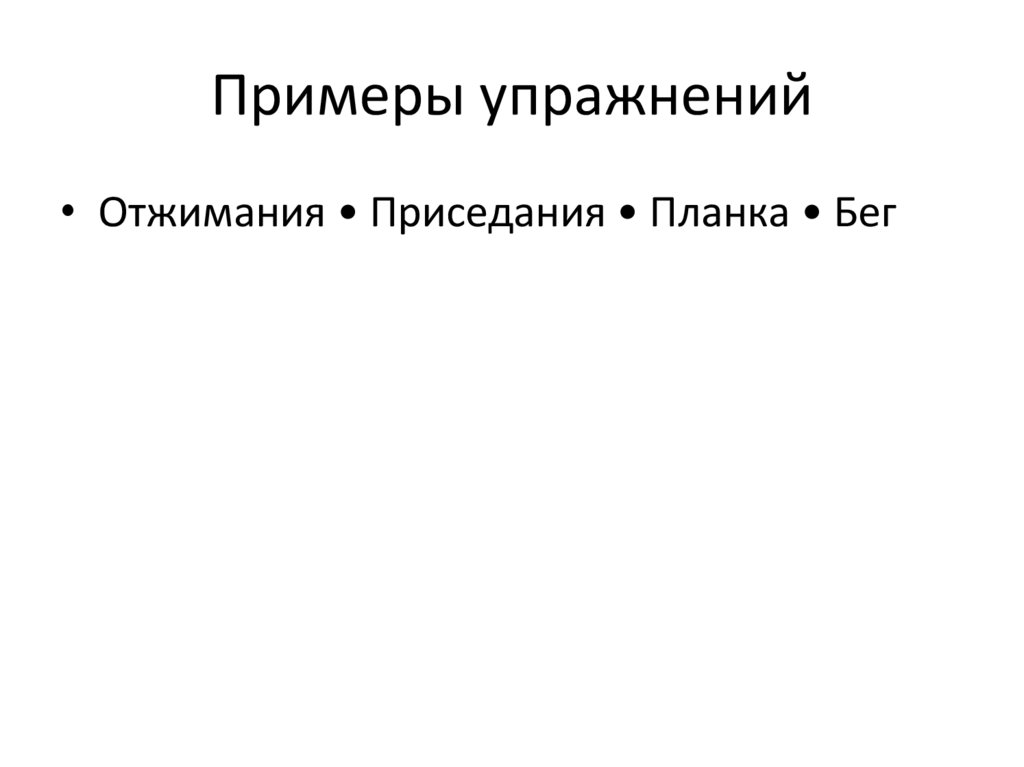 Примеры упражнений• Отжимания • Приседания • Планка • Бег