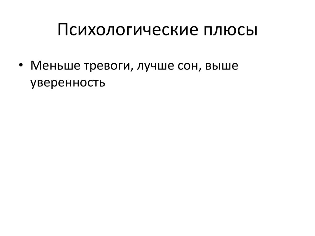 Психологические плюсы• Меньше тревоги, лучше сон, выше