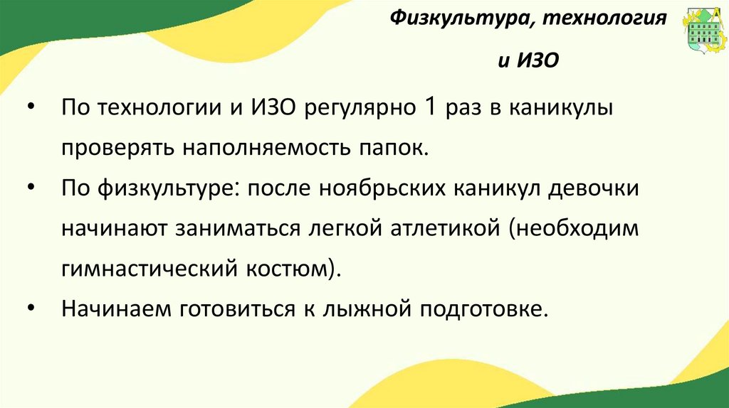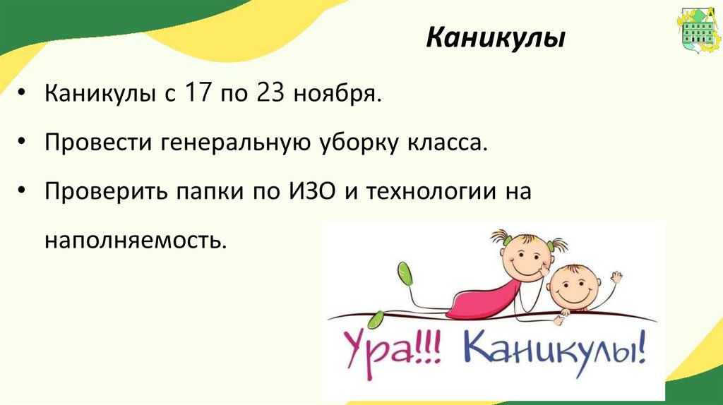 • По технологии и ИЗО регулярно 1 раз в каникулы
