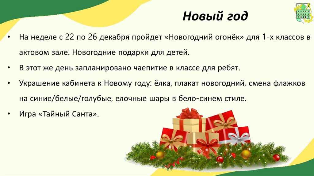 Новый годНа неделе с 22 по 26 декабря пройдет «Новогодний огонёк» для 1-х классов в