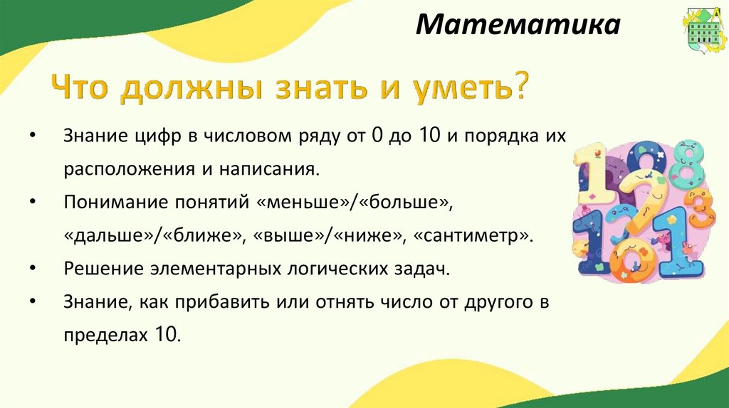 МатематикаЗнание цифр в числовом ряду от 0 до 10 и порядка их