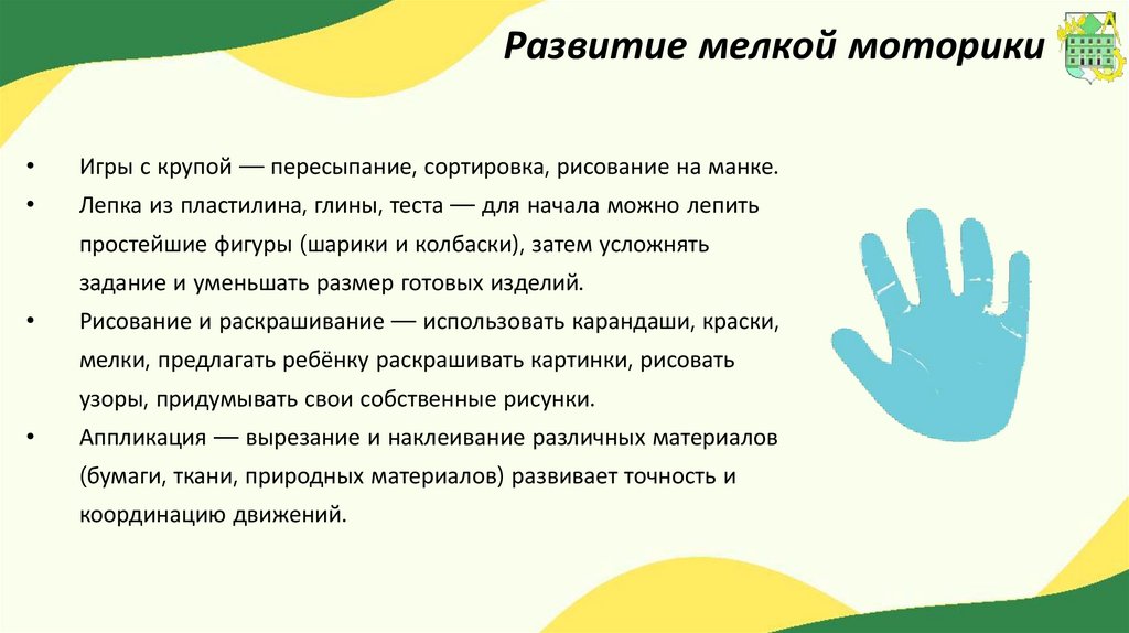 Развитие мелкой моторикиИгры с крупой — пересыпание, сортировка, рисование на манке.