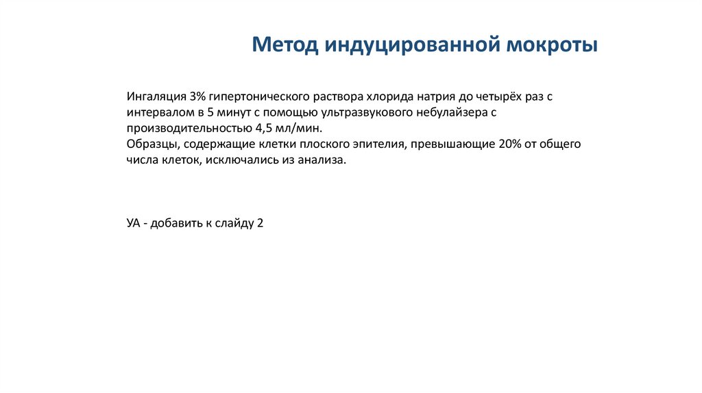 Метод индуцированной мокротыИнгаляция 3% гипертонического раствора хлорида натрия до четырёх раз с