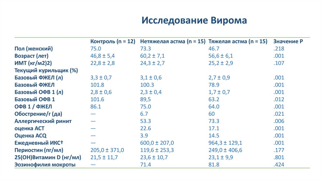 Связь между клиническими факторами и легочным виромомвстречаемости