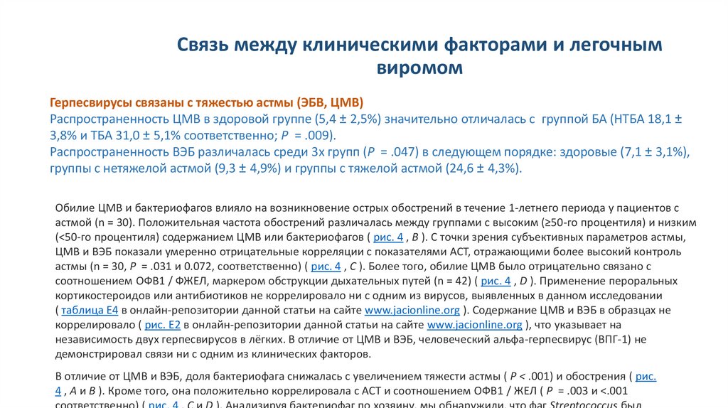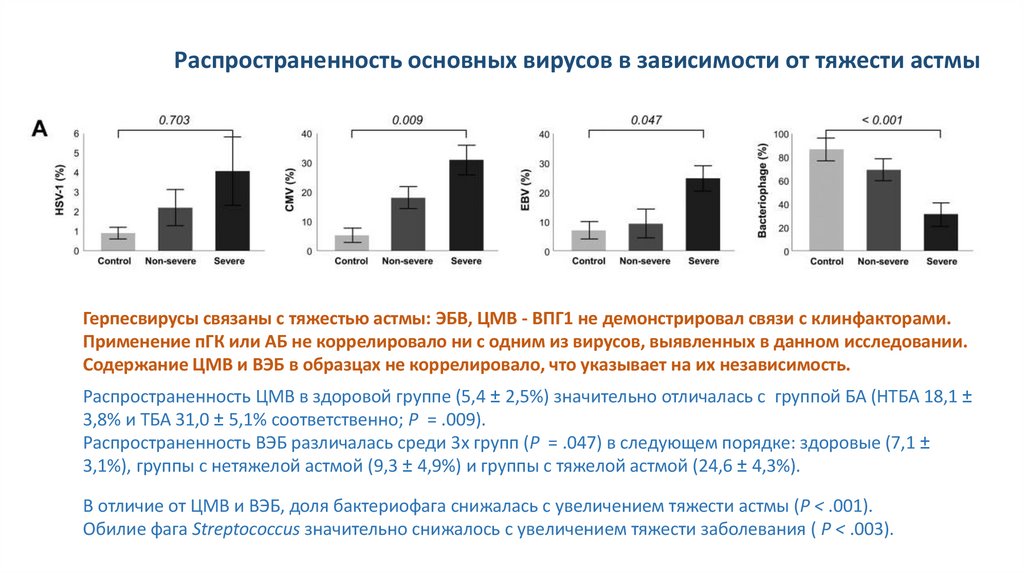 В отличие от ЦМВ и ВЭБ, доля бактериофага снижалась с увеличением тяжести астмы (P < .001).