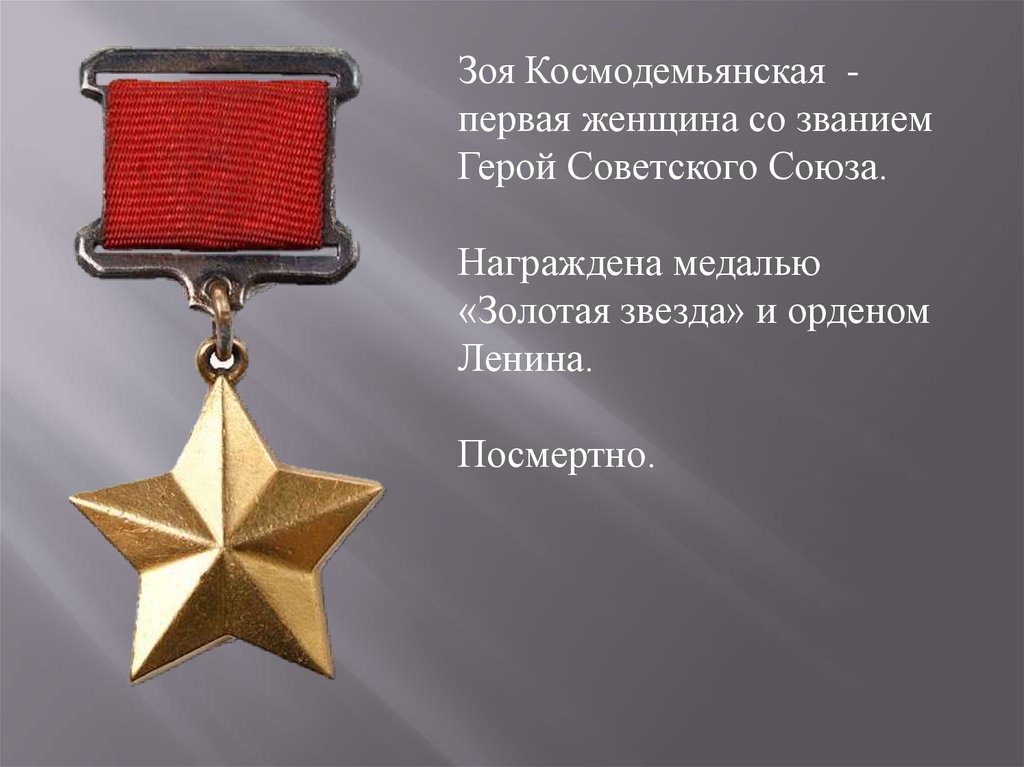 Зоя Космодемьянская первая женщина со званиемГерой Советского Союза.