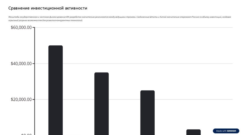 Срав нение инвестиционной активнос тиМасштабы государственного и частного финансирования ИИ-разработок значительно различаются между ведущими странами. Соединенные Штаты и Китай значительно опережают Россию по объему инвестиций, создавая
