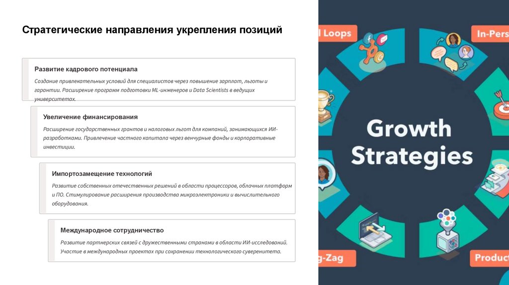 Расширение государственных грантов и налоговых льгот для компаний, занимающихся ИИразработками. Привлечение частного капитала через венчурные фонды и корпоративные