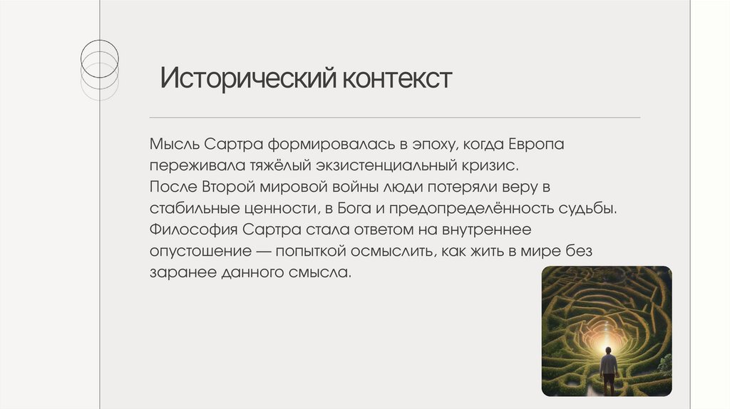 Исторический контекстМысль Сартра формировалась в эпоху, когда Европа