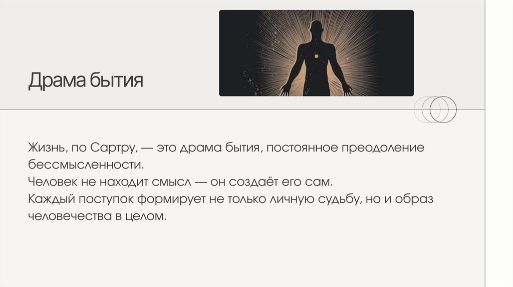 Драма бытияЖизнь, по Сартру, — это драма бытия, постоянное преодоление