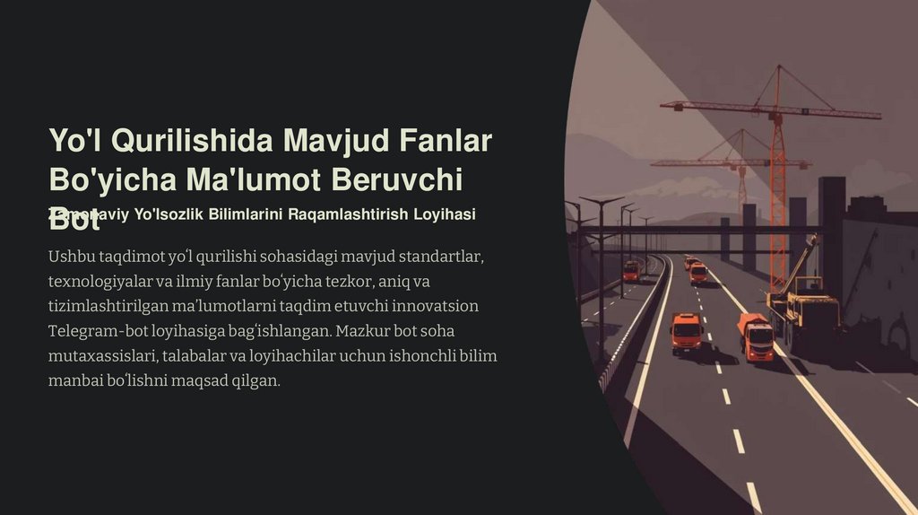 Botning Asosiy Funksiyalari: Qaysi Ma'lumotlarni Taqdim Etadi?Bot foydalanuvchilarga yoʻl qurilishi jarayonining har bir bosqichida zarur boʻladigan turli xil maʼlumotlarni taqdim etish uchun moʻljallangan.