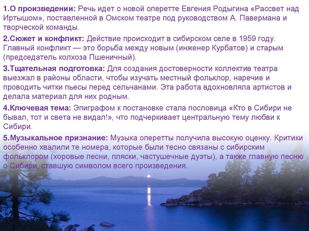 1.О произведении: Речь идет о новой оперетте Евгения Родыгина «Рассвет надИртышом», поставленной в Омском театре под руководством А. Павермана и