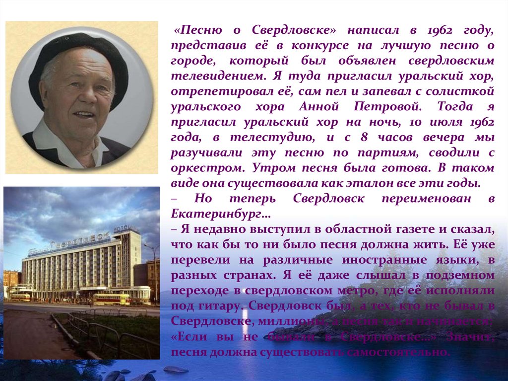 «Песню о Свердловске» написал в 1962 году,представив её в конкурсе на лучшую песню о