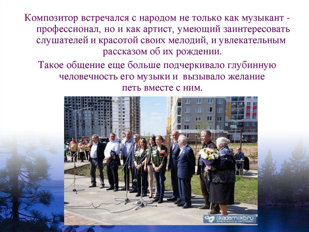 Композитор встречался с народом не только как музыкант профессионал, но и как артист, умеющий заинтересоватьслушателей и красотой своих мелодий, и увлекательным