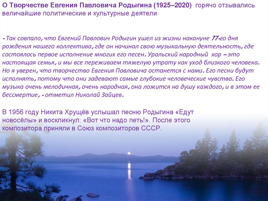 О Творчестве Евгения Павловича Родыгина (1925–2020) горячо отзывалисьвеличайшие политические и культурные деятели