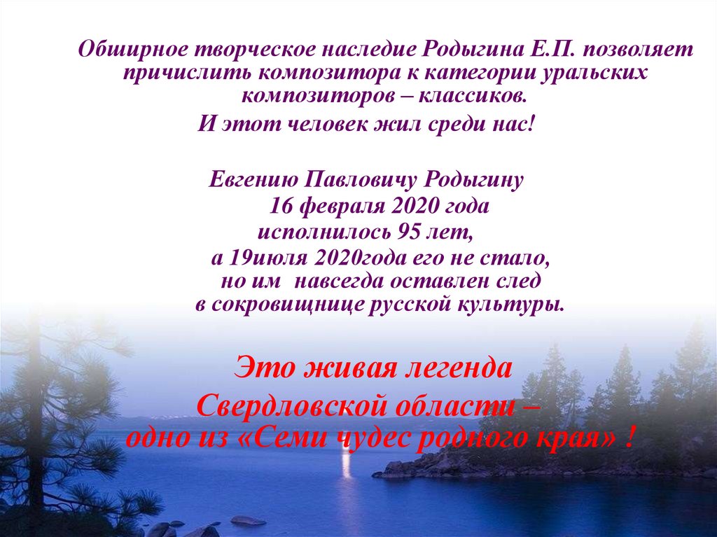 Обширное творческое наследие Родыгина Е.П. позволяетпричислить композитора к категории уральских