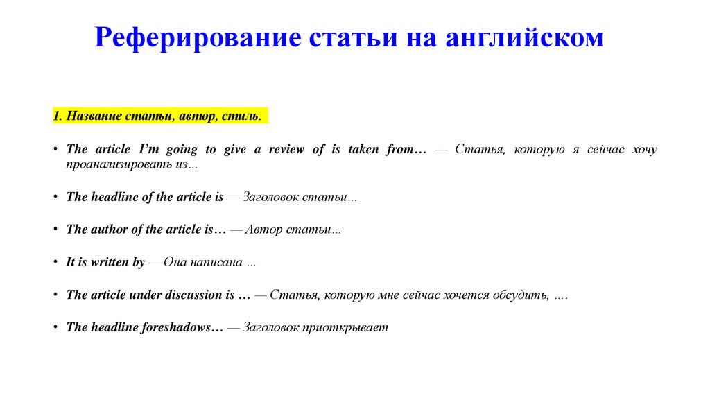 1. Название статьи, автор, стиль.• The article I’m going to give a review of is taken from… — Статья, которую я сейчас хочу