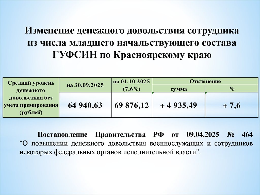 1. Изменение денежного довольствия сотрудника из числа младшего начальствующего состава ГУФСИН по Красноярскому краю