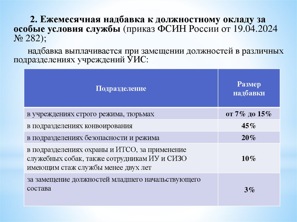 2. Ежемесячная надбавка к должностному окладу заособые условия службы (приказ ФСИН России от 19.04.2024